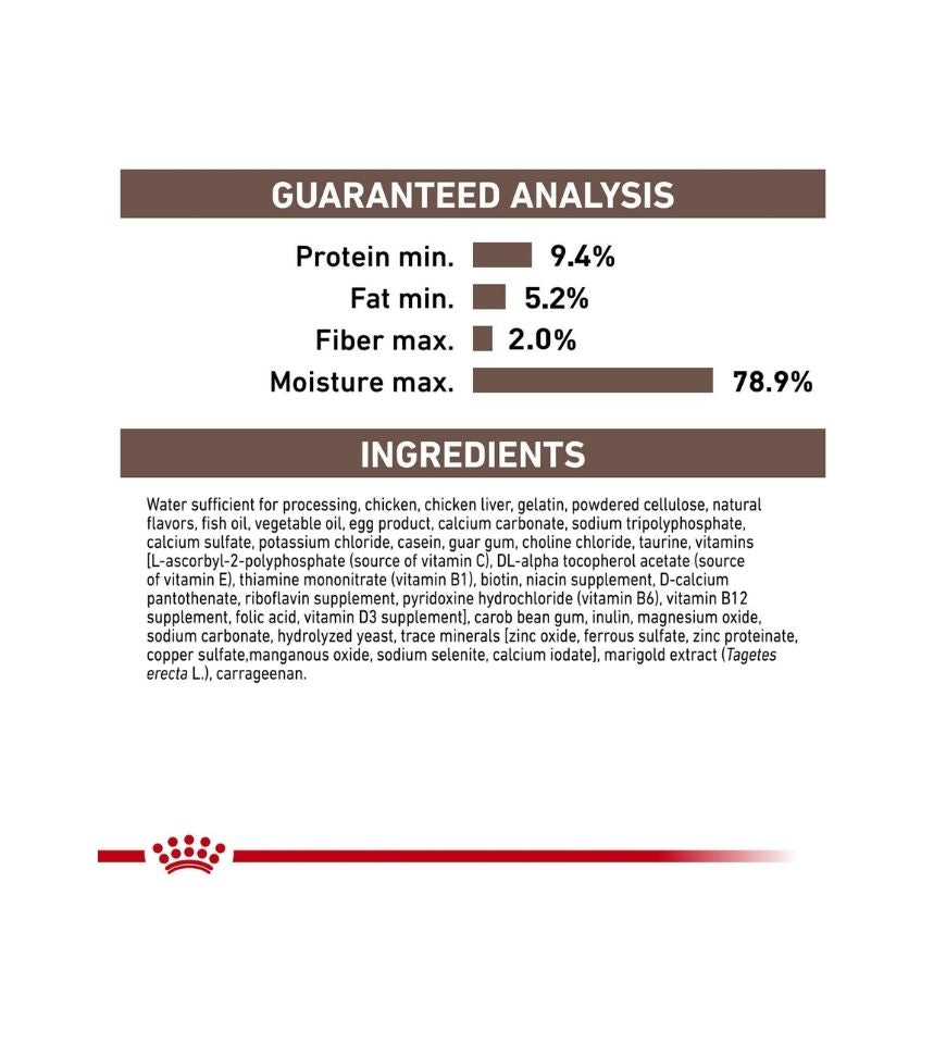 Ingredients: Water sufficient for processing, chicken, chicken liver, gelatin, powdered cellulose, natural flavors, fish oil, vegetable oil, egg product, calcium carbonate, sodium tripolyphosphate, calcium sulfate, potassium chloride, casein, guar gum, choline chloride, taurine, vitamins [L-ascorbyl-2-polyphosphate (source of vitamin C), DL-alpha tocopherol acetate (source of vitamin E), thiamine mononitrate (vitamin B1), biotin, niacin supplement, D-calcium pantothenate, riboflavin supplement, pyridoxine hydrochloride (vitamin B6), vitamin B12 supplement, folic acid, vitamin D3 supplement], carob bean gum, inulin, magnesium oxide, sodium carbonate, hydrolyzed yeast, trace minerals [zinc oxide, ferrous sulfate, zinc proteinate, copper sulfate, manganous oxide, sodium selenite, calcium iodate], marigold extract (Tagetes erecta L.), carrageenan.