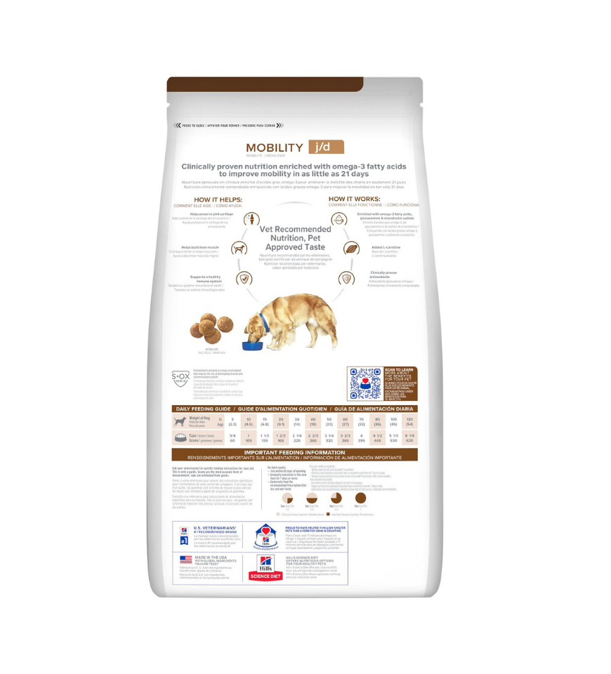 Improving your dog's mobility can be as easy as feeding the right nutrition early on and consistently. Hill's Prescription Diet j/d Mobility Dry Dog Food helps your dog walk, run and jump more easily in as little as 21 days. It is a complete and balanced food that provides all the nutrition your dog needs.